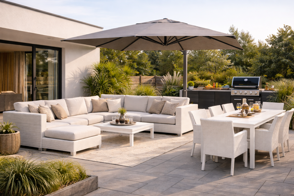 Na dużych tarasach jasne meble szczególnie dobrze się prezentują, ponieważ optycznie powiększają przestrzeń i nadają jej lekkości. Rozbudowane komplety wypoczynkowe, takie jak meble ogrodowe MURO XXII, pozwalają stworzyć reprezentacyjną strefę relaksu, która pozostaje funkcjonalna na co dzień.